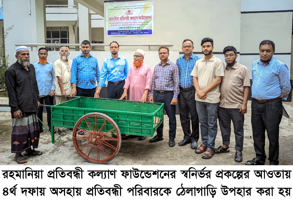 রহমানিয়া প্রতিবন্ধী কল্যাণ ফাউন্ডেশনের স্বনির্ভর প্রকল্পের আওতায় ৪র্থ দফায় অসহায় প্রতিবন্ধী পরিবারকে স্বাবলম্বী করার লক্ষ্যে ঠেলাগাড়ি উপহার প্রদান করা হয়েছে।