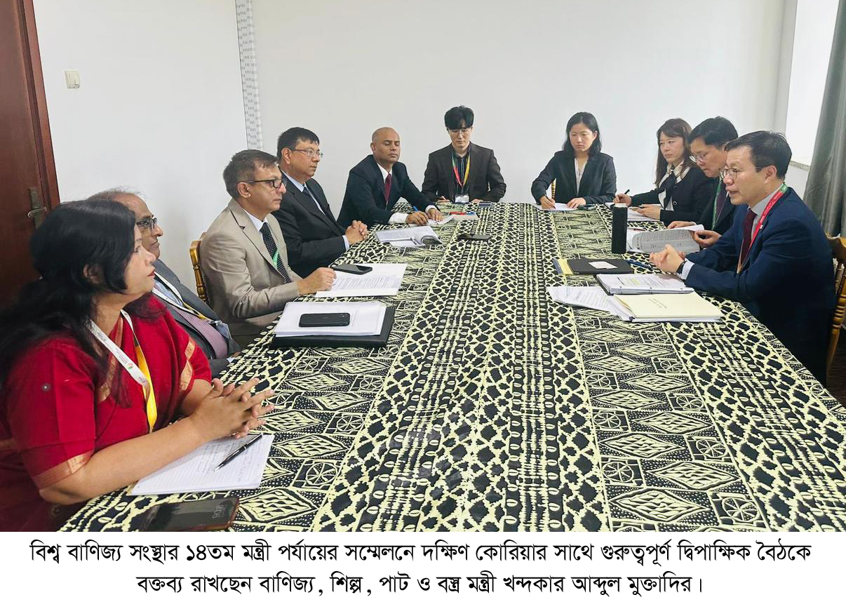 বিশ্ব বাণিজ্য সংস্থার ১৪তম মন্ত্রী পর্যায়ের সম্মেলনের সাইডলাইনে দক্ষিণ কোরিয়া এবং ইউরোপীয় ইউনিয়নের সাথে পৃথক দুটি গুরুত্বপূর্ণ দ্বিপাক্ষিক বৈঠক করেছে বাংলাদেশ।