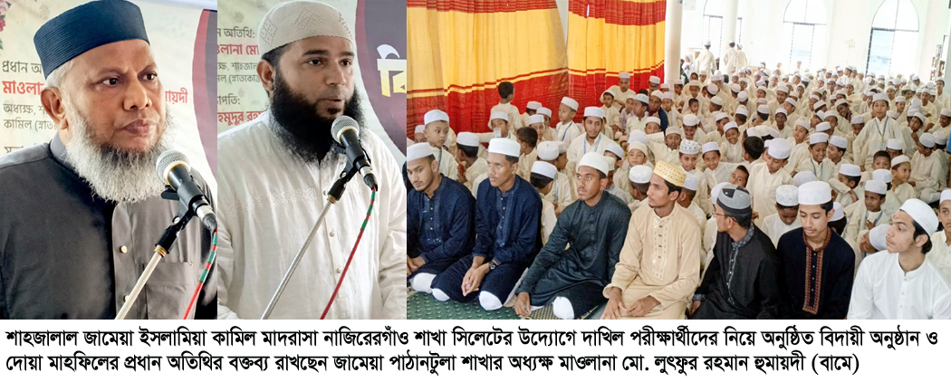 অপরদিকে ২০২৬ সালের দাখিল পরীক্ষার্থীদের বিদায় অনুষ্ঠানে প্রধান অতিথির বক্তব্য রাখেন- শাহজালাল জামেয়া ইসলামিয়া কামিল মাদ্রাসা পাঠানটুলার অধ্যক্ষ লুৎফুর রহমান হুমায়দী।