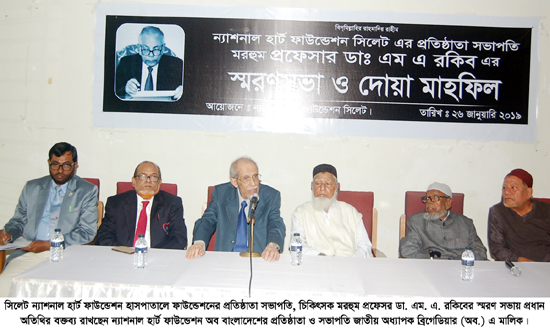 শনিবার (২৬ জানুয়ারি) সিলেট ন্যাশনাল হার্ট ফাউন্ডেশন হাসপাতালে ফাউন্ডেশনের প্রতিষ্ঠাতা সভাপতি সিলেট খ্যাতিমান চিকিৎসক মরহুম প্রফেসর ডা. এম. এ. রকিবের স্মরণ সভা ও দোয়া মাহফিলে ন্যাশনাল হার্ট ফাউন্ডেশন অব বাংলাদেশের প্রতিষ্ঠাতা ও সভাপতি জাতীয় অধ্যাপক ব্রিগেডিয়ার (অব.) এ মালিক এ কথা বলেন।