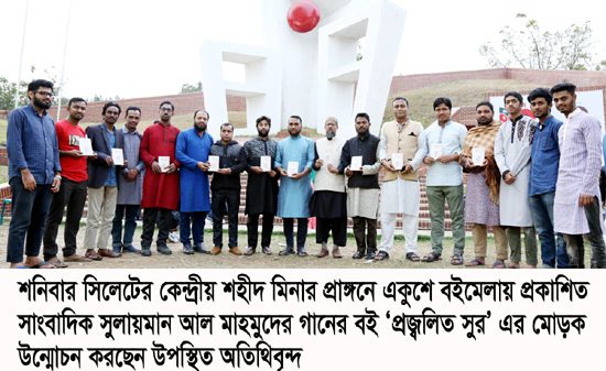 শনিবার (৯ ফেব্রুয়ারি) বিকেলে সিলেট কেন্দ্রীয় শহীদ মিনার প্রাঙ্গনে অনুষ্ঠিত প্রথম আলো বন্ধুসভা একুশে বইমেলায় অনুষ্ঠিত সাংবাদিক সুলায়মান আল মাহমুদের গানের বই ‘প্রজ্বলিত সুর’এর মোড়ক উন্মোচন অনুষ্ঠানে বক্তারা উপরোক্ত কথা বলেন। মোড়ক উন্মোচন অনুষ্ঠানে উপস্থিত ছিলেন- বিশিষ্ট লেখক ও গবেষক আব্দুর রহীম, গীতিকার ও সুরকার মতিউর রহমান খালেদ, কানাইঘাট প্রেসক্লাবের সভাপতি শাহজাহান সেলিম বুলবুল, শেকর সন্ধানী লেখক কবি সরওয়ার ফারুকী, প্রাবন্ধিক বায়েজিদ মাহমুদ ফয়সল, প্রবাস বাংলা টিভির সিলেট ব্যুরো এনামুল হক, দৈনিক জালালাবাদের স্টাফ রিপোর্টার মুনশি ইকবাল, লেখক জুবায়ের আহমদ, কবি তাসনিম জায়েদ, শিল্পী ইমরান আনসারী, ছড়াকার শাহজাহান শাহেদ, অভিনেতা সামসুজ্জামান মাহবুব, ছাড়াকার মুয়াজ বিন এনাম, শিল্পী তাওহীদ সুফিয়ান ও শাহান আহমদ প্রমুখ।