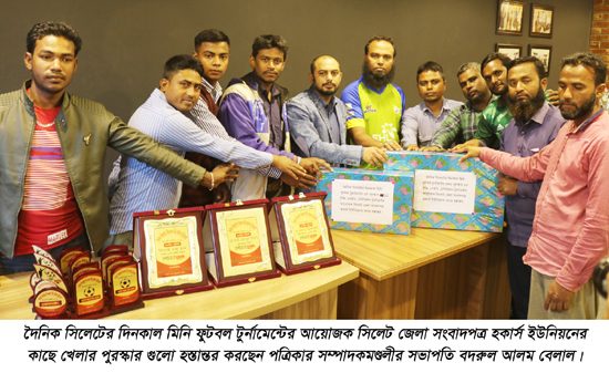 দৈনিক সিলেটের দিনকাল মিনি ফুটবল টুর্নামেন্টের আয়োজক সিলেট জেলা সংবাদপত্র হকার্স ইউনিয়নের কাছে খেলার ১ম পুরস্কার ২৪ ইঞ্চি এলইডি টেলিভিশন ও ২য় পুরস্কার ১৯ ইঞ্চি এলইডি টেলিভিশনসহ টুর্নামেন্টের যাবতীয় সকল পুরস্কার হস্তান্তর করা হয়েছে।