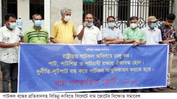 রাষ্ট্রীয় পাটকল বন্ধের সিদ্ধান্ত বাতিল, পাটকল বন্ধ নয় আধুনিকায়ন করা, পাট খাতে দুর্নীতি-লুটপাট বন্ধ, ভুলনীতি পরিহার, দুর্নীতি-অনিয়ম-লুটপাট বন্ধ সহ বিভিন্ন দাবিতে বাম গণতান্ত্রিক জোট সিলেট জেলা শনিবার (২৯ আগস্ট) বিকাল ৫টায় সিলেট কোর্ট পয়েন্টে বিক্ষোভ সমাবেশ অনুষ্ঠিত হয়।