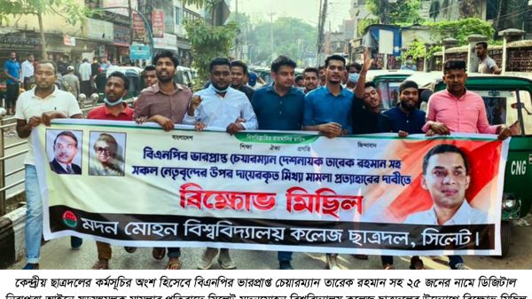 কেন্দ্রীয় ছাত্রদলের কর্মসূচির অংশ হিসেবে বিএনপির ভারপ্রাপ্ত চেয়ারম্যান তারেক রহমান সহ ২৫ জনের নামে ডিজিটাল নিরাপত্তা আইনে ষড়যন্ত্রমূলক মামলার প্রতিবাদে সিলেট মদনমোহন বিশ্ববিদ্যালয় কলেজ ছাত্রদলের উদ্যোগে এক বিক্ষোভ মিছিল বের করা হয়েছে।