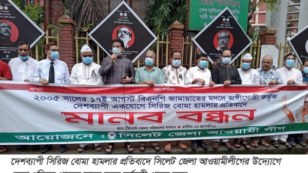 সিরিজ বোমা হামলার প্রতিবাদে সিলেট জেলা আওয়ামী লীগ কর্তৃক আয়োজিত মানববন্ধন কর্মসূচিতে সিলেট জেলা আওয়ামী লীগের সাধারণ সম্পাদক এডভোকেট মোঃ নাসির উদ্দিন খান তার বক্তব্যে উপরোক্ত কথাগুলো বলেন।