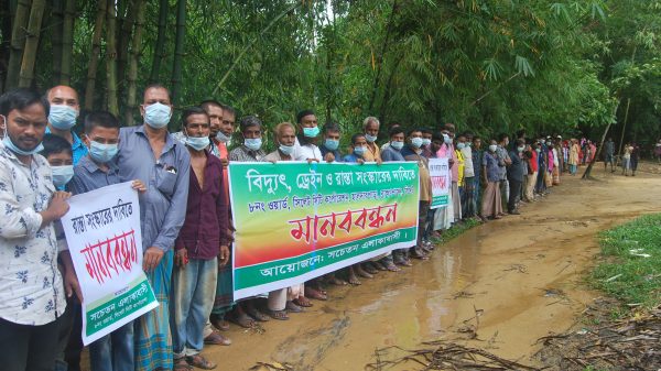 মানববন্ধনে বক্তারা বলেন, হাওলদারপাড়ার কয়েক হাজার মানুষের যাতায়াতের একমাত্র রাস্তটি দীর্ঘদিন যাবৎ সংস্কারের অভাবে চলাচলের অযোগ্য হয়ে রয়েছে। রাস্তা ড্রেন সংস্কার না হওয়ায় মানুষজন চরম দুর্ভোগে পড়েছেন।