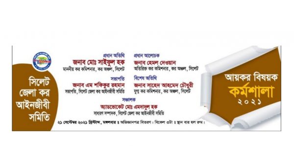 সিলেট জেলা কর আইনজীবী সমিতির উদ্যোগে ও আয়োজনে কর আইনজীবীদের পেশাগত উন্নতি সাধনকল্পে আজ মঙ্গলবার (২১ সেপ্টেম্বর) বার হলরুমে সকাল ১১টা থেকে দিনব্যাপী একটি আয়কর কর্মশালা-২০২১ অনুষ্ঠিত হবে।