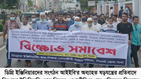 ডিপ্লোমা প্রকৌশলীদের বিরুদ্ধে ডিগ্রি ইঞ্জিনিয়ারদের সংগঠন ইঞ্জিনিয়ার্স ইনস্টিটিউশন, বাংলাদেশ (আইইবি)’র অব্যাহত ষড়যন্ত্রের প্রতিবাদে এবং মাননীয় প্রধানমন্ত্রী প্রতিশ্রুতি অনুযায়ী ডিপ্লোমা ইঞ্জিনিয়ারদের পেশাগত সমস্যা সমাধান এবং ডিপ্লোমা ইঞ্জিনিয়ারিং শিক্ষা কোর্সের মেয়াদ ৪ বছর থেকে ৩ বছরে হ্রাসে শিক্ষা মন্ত্রণালয়ের আত্মঘাতি উদ্যোগ বন্ধ, ডিপ্লোমা প্রকৌশলীদের প্রাথমিক নিযুক্তিতে বর্ধিত ইনক্রিমেন্ট, ৫০% পদোন্নতি, জনকল্যাণকর অর্গানোগ্রাম প্রণয়ন, বাংলাদেশ ন্যাশনাল বিল্ডিং কোড ২০২০ ও ঢাকা ইমারত নির্মাণ বিধিমালার বিতর্কিত সংজ্ঞা ও বিভিন্ন ধারা/উপধারা সংশোধনপূর্বক গেজেট প্রকাশ সহ ৪ দফা দাবিতে কেন্দ্রীয় কর্মসূচির অংশ হিসেবে সিলেটে মঙ্গলবার (২১ সেপ্টেম্বর) সকাল সাড়ে ১১টা হতে বেলা ১টা ৩০মিনিট পর্যন্ত সিলেট কেন্দ্রীয় শহীদ মিনার প্রাঙ্গণে বাংলাদেশ ডিপ্লোমা ইঞ্জিনিয়ারিং ছাত্র শিক্ষক পেশাজীবি সংগ্রাম পরিষদ সিলেট জেলা শাখার উদ্যোগে বিক্ষোভ সমাবেশ অনুষ্ঠিত হয়।