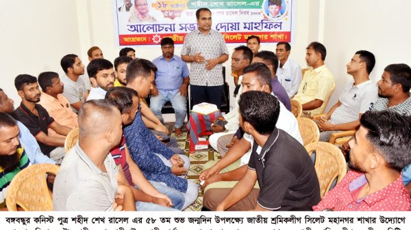 বঙ্গবন্ধুর কনিস্ট পুত্র শহীদ শেখ রাসেলের ৫৮তম শুভ জন্মদিন উপলক্ষ্যে জাতীয় শ্রমিকলীগ সিলেট মহানগর শাখার উদ্যোগে দোয়া ও মিলাদ মাহফিল অনুষ্ঠিত হয়েছে। সোমবার (১৮ অক্টোবর) বিকাল ৫টা নগরীর সোবহানীঘাট অস্থায়ী কার্যালয়ে দোয়া, মিলাদ মাহফিল ও শিরনী বিতরণ অনুষ্ঠানের আয়োজন করা হয়।