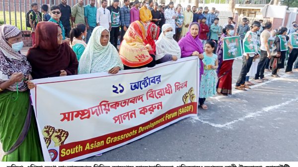 দক্ষিণ এশিয়া তথা বাংলাদেশের বিভিন্ন জায়গায় সাম্প্রদায়িকতা প্রতিরোধে তৃণমুল নারী উদ্যোক্তা সোসাইটি (গ্রাসরুটস) এর উদ্যোগে কেন্দ্রীয় কর্মসূচীর অংশ হিসেবে এক মানববন্ধন অনুষ্ঠিত হয়েছে।