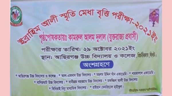 যুক্তরাজ্য প্রবাসী কামরুল আলম দুলালের পৃষ্ঠপোষকতায় ইব্রাহিম আলী স্মৃতি মেধা বৃত্তি পরীক্ষা আগামীকাল শুক্রবার (২৯ অক্টোবর) সকাল ১১টায় অনুষ্ঠিত হবে। বিয়ানীবাজার উপজেলার আছিরগঞ্জ উচ্চ বিদ্যালয় ও কলেজে এই মেধা বৃত্তি পরীক্ষা আয়োজন করা হয়েছে।