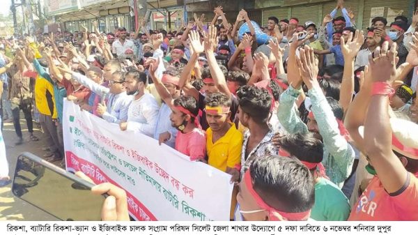 রিকশা, ব্যাটারি রিকশা-ভ্যান ও ইজিবাইক চালক সংগ্রাম পরিষদ সিলেট জেলা শাখার উদ্যোগে ৫ দফা দাবিতে শনিবার (৬ নভেম্বর) দুপুর ১২টায় আম্বরখানাস্থ সংগঠনের কার্যালয়ের সামনে বিশাল মানববন্ধন ও প্রতিবাদ সমাবেশ অনুষ্ঠিত হয়।