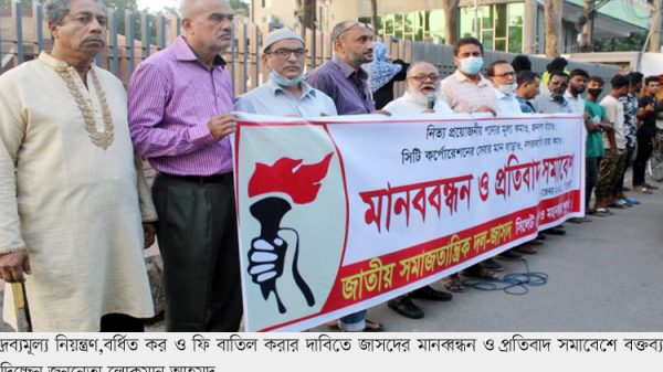 নিত্য প্রয়োজনীয় পন্যের মূল্য কমাও, জনগণ বাচাঁও, সিলেট সিটি কর্পোরেশনের সেবার মান বাড়াও, নগর বাসীর ব্যয় কমাও এই শ্লোগান কে সামনে রেখে জাতীয় সমাজতান্ত্রিক দল জাসদ সিলেট জেলা ও মহানগর জাসদের উদ্যোগে মঙ্গলবার (২৩ নভেম্বর) বিকাল ৪টায় সিলেট কেন্দ্রীয় শহীদ মিনারের সম্মুখে মানববন্ধন ও প্রতিবাদ সভা অনুষ্ঠিত হয়েছে।