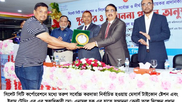 বুধবার (২৪ নভেম্বর) নগরীর মেন্দিবাগস্থ হোটেল গ্র্যান্ড সুরমার হলরুমে সিলেট কর অঞ্চল আয়োজিত সিলেট সিটি কর্পোরেশন ও সিলেট জেলার সর্বোচ্চ দীর্ঘ সময় আয়কর প্রদানকারী করদাতাদের মধ্যে পুরস্কার ও সম্মাননা প্রদান অনুষ্ঠানে প্রধান অতিথি সিলেট কাস্টমস কমিশার এক্সাইজ ও ভ্যাট কমিশনারেট মোহাম্মদ আহসানুল হক মেসার্স টাইকোন ষ্টেশন এবং ইরাম ট্রেডিং এর স্বত্ত্বাধিকারী মো: এনামুল হক এর হাতে তরুণ করদাতার পুরস্কার তুলে দেন।