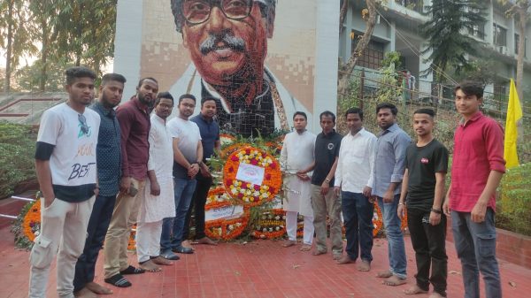 বৃহস্পতিবার (১৭ মার্চ) সিলেট এমসি কলেজ প্রাঙ্গনে অবস্থিত বঙ্গবন্ধু ম্যুারালে ফুল দিয়ে শ্রদ্ধা নিবেদন করেন আমুস সিলেট জেলা ও মহানগর শাখার নেতৃবৃন্দ।