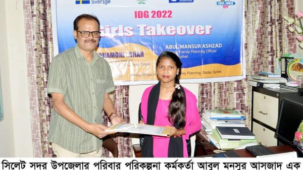 আন্তর্জাতিক কন্যা দিবস উপলক্ষে (গার্লস টেকওভার) সিলেট সদর উপজেলার পরিবার পরিকল্পনা অধিদপ্তরের কর্মকর্তা আবুল মনসুর আসজাদ এর দায়িত্ব এক ঘন্টার জন্য পালন করলো চা-শ্রমিকের মেয়ে গ্রীন সিটি কলেজিয়েট স্কুলের দশম শ্রেণির ছাত্রী সোনামণি লোহার।