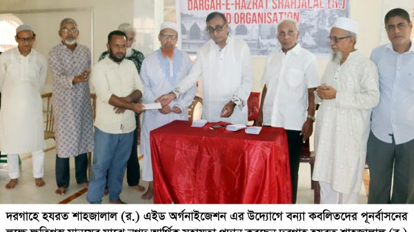 দরগাহে হযরত শাহজালাল (র.) এইড অর্গানাইজেশন এর উদ্যোগে বন্যা কবলিতদের পূনর্বাসনের লক্ষে কানাইঘাট, গোয়াইনঘাট, ছাতক, মুল্লার গাঁও, জাফলং ও মোগলাবাজার সহ বিভিন্ন এলাকার ক্ষতিগ্রস্থ মানুষের মাঝে নগদ আর্থিক সহায়তা প্রদান করা হয়েছে।