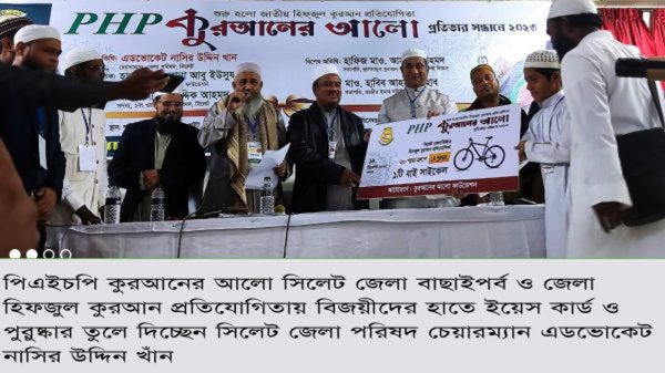 পিএইচপি কুরআনের আলো ফাউন্ডেশনের জাতীয় হিফযুল কুরআন প্রতিযোগিতায় সিলেট জেলা বাছাই পর্বের ইয়েস কার্ড প্রদান অনুষ্ঠানে সিলেট জেলা পরিষদ চেয়ারম্যান এডভোকেট নাসির উদ্দিন খাঁন বলেছেন, কুরআনের আলো হচ্ছে প্রকৃত আলো, দেশের মাদরাসা পড়ুয়া ক্ষুদে হাফিজগণ আমাদের দেশের অমূল্য সম্পদ। তাদের মাধ্যমে বাংলাদেশ আজ বিশ্ব দরবারে আরও পরিচিত হচ্ছে।