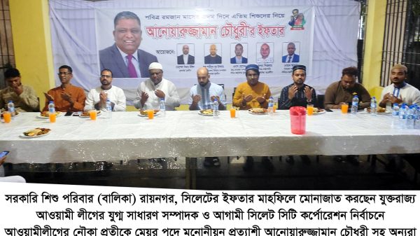 শুক্রবার (২৪ মার্চ) সরকারি শিশু পরিবার (বালিকা) রায়নগর, সিলেটে যুক্তরাজ্য যুবলীগ নেতা মোহাম্মদ নিজাম উদ্দিন, যুক্তরাজ্য যুবলীগের তথ্য ও গবেষণা বিষয়ক সম্পাদক শাহ শাহিদুন নূর ইসলাম, লন্ডন মহানগর যুবলীগের যুগ্ম সাধারণ সম্পাদক এনাম হোসেন, যুক্তরাজ্য ছাত্রলীগের সহ-সভাপতি স্বপন শিকদার, বার্মিংহাম ছাত্রলীগের সাধারণ সম্পাদক নোমান আহমদ এর যৌথ উদ্যোগে এই ইফতার মাহফিলে উপস্থিত হোন তিনি।