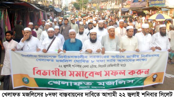 চলমান রাজনৈতিক সংকট নিরসনে দল নিরপেক্ষ নির্বাচনকালীন সরকারের অধীনে জাতীয় নির্বাচন, দ্রব্যমূল্যের উর্ধগতি রোধসহ খেলাফত মজলিসের ৮দফা বাস্তবায়নের দাবিতে আগামী শনিবার (২২ জুলাই) সিলেট রেজিস্টারী মাঠে খেলাফত মজলিসের বিভাগীয় সমাবেশ সফলের লক্ষ্যে সংগঠনের সিলেট মহানগরী শাখার উদ্দ্যোগে নগরীতে প্রচার মিছিল ও সমাবেশ অনুষ্ঠিত হয়।