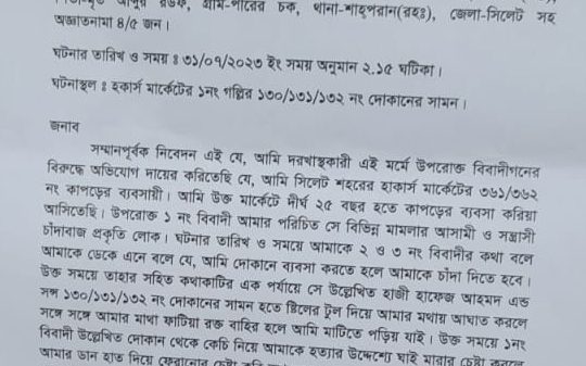 এ ঘটনায় মঙ্গলবার (১ আগস্ট) সিলেট কোতোয়ালি মডেল থানায় লিখিত অভিযোগ দায়ের করা হয়েছে।