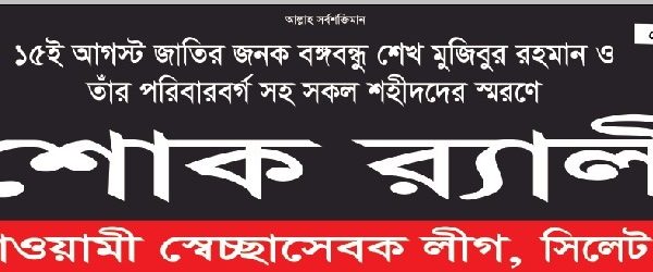 জাতির পিতা বঙ্গবন্ধু শেখ মুজিবুর রহমান, বঙ্গমাতা শেখ ফজিলাতুন্নেছা মুজিবসহ ১৫ আগস্ট সকল শহিদের প্রতি শ্রদ্ধা জানিয়ে সিলেটে শোক র্যালি করবে আওয়ামী স্বেচ্ছাসেবক লীগ সিলেট জেলা ও মহানগর শাখা।