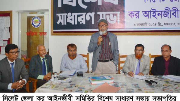 সিলেট জেলা কর আইনজীবী সমিতির সভাপতি এম ই এম ইকবালুর রহমান এডভোকেট এর সভাপতিত্বে ও যুগ্ম সাধারণ সম্পাদক মোহাম্মদ আজিজুর রহমান এডভোকেট এর পরিচালনায় সাধারণ সভার শুরুতে স্বাগত বক্তব্য রাখেন, সমিতির সাধারণ সম্পাদক মো. সফিকুল ইসলাম এডভোকেট।
