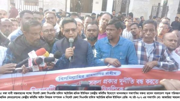 ৫ দফা দাবী বাস্তবায়নের লক্ষ্যে সিলেট জেলা সিএনজি চালিত অটোরিক্সা শ্রমিক ইউনিয়ন রেজি: নং চট্ট-৭০৭ কেন্দ্রীয় কমিটির উদ্যোগে মানববন্ধন অনুষ্ঠিত হয়েছে।