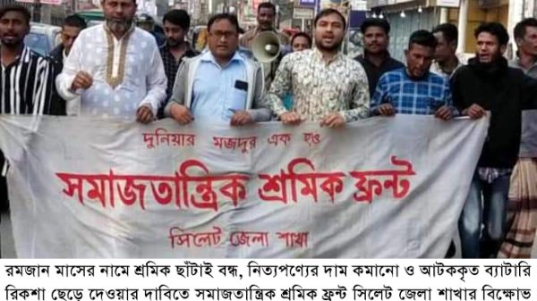 রমজান মাসের নামে শ্রমিক ছাঁটাই-নিত্যপণ্যের মূল্যবৃদ্ধির প্রতিবাদে ও সিলেট মহানগর ট্রাফিক কর্তৃপক্ষ কর্তৃক আটককৃত ব্যাটারি চালিত যানবাহন ছেড়ে দেওয়ার দাবিতে সমাজতান্ত্রিক শ্রমিক ফ্রন্ট সিলেট জেলা শাখার উদ্যোগে বিক্ষোভ মিছিল ও সমাবেশ অনুষ্ঠিত হয়।