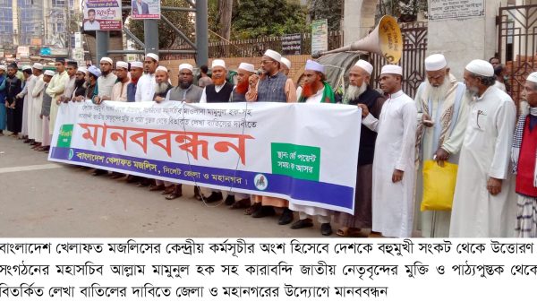 বাংলাদেশ খেলাফত মজলিসের কেন্দ্রীয় কর্মসূচীর অংশ হিসেবে দেশকে বহুমুখী সংকট থেকে উত্তোরণ, সংগঠনের মহাসচিব আল্লাম মামুনুল হক সহ কারাবন্দি জাতীয় নেতৃবৃন্দের মুক্তি ও পাঠ্যপুস্তক থেকে বিতর্কিত লেখা বাতিলের দাবিতে মানববন্ধন কর্মসূচী শুক্রবার (১ মার্চ) বাদ আসর নগরীর কোর্ট পয়েন্টে জেলা ও মহানগরের উদ্যোগে জেলা সভাপতি মাওলানা ইকবাল হোসাইন এর সভাপতিত্বে ও মহানগর সাধারণ সম্পাদক আলহাজ¦ মাওলানা এমরান আলম ও জেলা সহ-সাধারণ সম্পাদক মুফতি মাওলানা মাহবুবুল হকের পরিচালনায় অনুষ্ঠিত হয়।