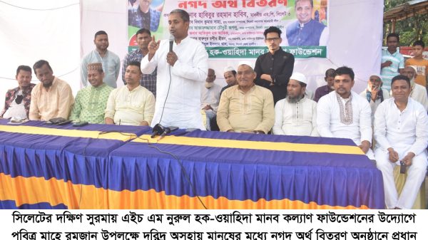 সিলেটের দক্ষিণ সুরমায় এইচ এম নুরুল হক-ওয়াহিদা মানব কল্যাণ ফাউন্ডেশনের উদ্যোগে পবিত্র মাহে রমজান উপলক্ষে দরিদ্র অসহায় মানুষের মধ্যে নগদ অর্থ বিতরণ অনুষ্ঠান শুক্রবার (১৫ মার্চ) বিকেলে মোগলাবাজার থানাধিন কোনারচর গ্রামের ওয়াহিদা মঞ্জিলের সামনে অনুষ্ঠিত হয়।
