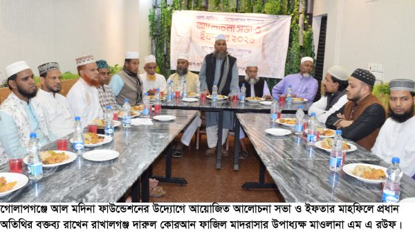 আল মদিনা ফাউন্ডেশন গোলাপগঞ্জের উদ্যোগে আলোচনা সভা ও ইফতার অনুষ্ঠিত হয়। সোমবার গোলাগঞ্জের একটি অভিজাত হোটেলে আয়োজিত অনুষ্ঠানে আল মদিনা ফাউন্ডেশন গোলাপগঞ্জের চেয়ারম্যান হাফিজ ছাদ উদ্দিনের সভাপতিত্বে ও সেক্রেটারি সৈয়দ এম এ হাসনাতের পরিচালনায় আলোচনা সভায় প্রধান অতিথির বক্তব্য রাখেন, রাখালগঞ্জ দারুল কোরআন ফাজিল মাদরাসার প্রিন্সিপাল মাওলানা এম রউফ।