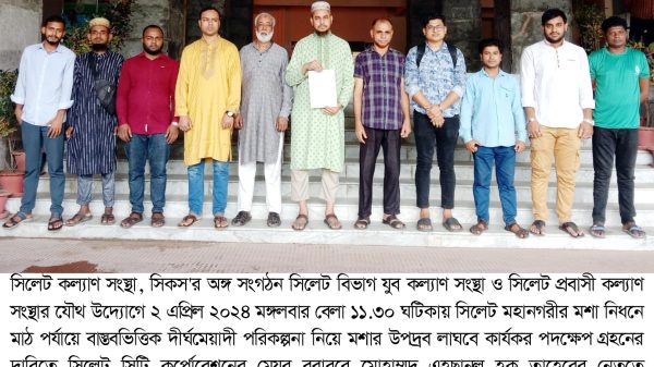 সিলেট কল্যাণ সংস্থা, সিকস’র অঙ্গ সংগঠন সিলেট বিভাগ যুব কল্যাণ সংস্থা ও সিলেট প্রবাসী কল্যাণ সংস্থার যৌথ উদ্যোগে মঙ্গলবার (২ এপ্রিল ২০২৪) বেলা সাড়ে ১১টায় সিলেট মহানগরীর মশা নিধনে মাঠ পর্যায়ে বাস্তবভিত্তিক দীর্ঘমেয়াদী পরিকল্পনা নিয়ে মশার উপদ্রব লাঘবে কার্যকর পদক্ষেপ গ্রহনের দাবিতে সিলেট সিটি কর্পোরেশনের মেয়র বরাবরে স্মারকলিপি প্রদান করা হয়।