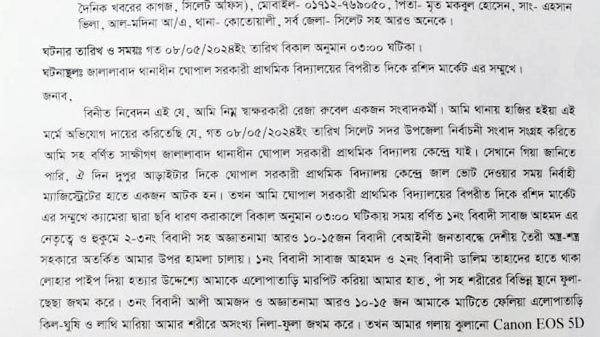 শুক্রবার (১০ মে) বিকেলে অভিযোগ দায়ের করেন রেজা রুবেল। অভিযোগে তিনি উল্লেখ করেন, একজন সংবাদকর্মী হিসেবে গত ৮ মে ২০২৪ইং তারিখ সিলেট সদর উপজেলা নির্বাচনী সংবাদ সংগ্রহ করিতে গিয়ে সহকর্মীদের সম্মুখে জালালাবাদ থানাধীন ঘোপাল সরকারী প্রাথমিক বিদ্যালয় কেন্দ্রে ঘোপাল এলাকার মৃত বতুল্লার ছেলে সাবাজ আহমদ, ডালিম আহমদ ও বাঘারপাড়ার আলী আমজদের নেতৃত্বে অজ্ঞাতনামা ১০/১৫জন ব্যক্তি তার উপর হামলা চালায়।