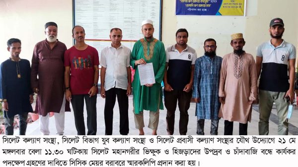 বৃহত্তর সিলেটের অরাজনৈতিক কল্যাণমূলক স্বেচ্ছাসেবী সামাজিক সংগঠন সিলেট কল্যাণ সংস্থা, সিলেট বিভাগ যুব কল্যাণ সংস্থা ও সিলেট প্রবাসী কল্যাণ সংস্থার যৌথ উদ্যোগে মঙ্গলবার (২১ মে) বেলা সাড়ে ১১টায় সিলেট মহানগরীর ভিক্ষুক ও হিজড়াদের উপদ্রব ও চাঁদাবাজি বন্ধের দাবিতে সিলেট সিটি কর্পোরেশনের মেয়র বরাবরে স্মারকলিপি প্রদান করা হয়।