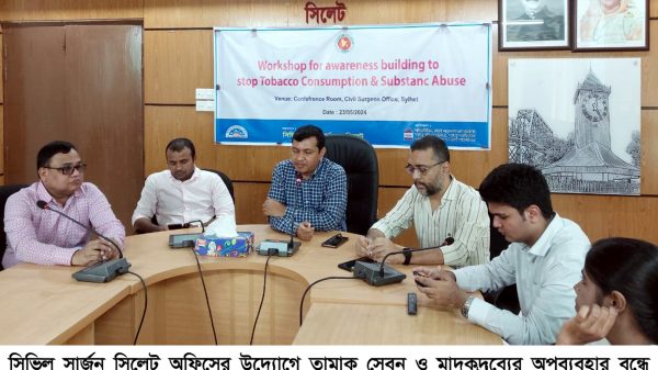 সিভিল সার্জন সিলেট অফিসের উদ্যোগে তামাক সেবন ও মাদকদ্রব্যের অপব্যবহার বন্ধে সচেতনতা বৃদ্ধির জন্য কর্মশালা অনুষ্ঠিত হয়েছে।