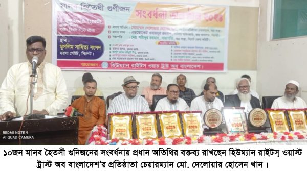 হিউম্যান রাইটস্ ওয়াস্ট ট্রাস্ট অব বাংলাদেশ সিলেট জেলা শাখার উদ্যোগে আয়োজিত বিভিন্ন ক্ষেত্রে অবদান রাখার জন্য ১০ জন মানব হৈতসী গুনিজনের সংবর্ধনা মঙ্গলবার (৪ জুন) কেমুসাসের সাহিত সভা কক্ষে বেলা ৩টায় অনুষ্ঠিত হয়।