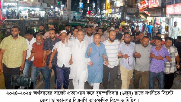 ২০২৪-২০২৫ অর্থবছরের বাজেট প্রত্যাখ্যান করে বৃহস্পতিবার (৬ জুন) রাতে নগরীতে বিক্ষোভ করেছে সিলেট জেলা ও মহানগর বিএনপি। তাৎক্ষণিক মিছিলটি সিলেট কোর্ট পয়েন্ট থেকে শুরু হয়ে জিন্দাবাজার এসে শেষ হয়।