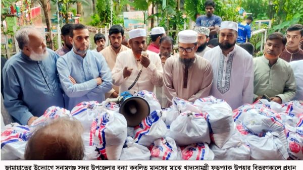 সীমাহীন জেল-জুলুম-নির্যাতন, নেতৃবৃন্দকে ফাঁসি দিয়ে হত্যা, হামলা-মামলা স্বত্তেও জামায়াত আর্ত মানবতার কল্যাণে সর্বদা কাজ করে যাচ্ছে। সুনামগঞ্জের বন্যার্ত মানুষের পাশে দাঁড়াতে আমরা সুদুর ঢাকা থেকে সাধ্যমত উপহার সামগ্রী নিয়ে এসেছি। আমরা বাংলাদেশী, আমরা ভাই ভাই। তাই আপনাদের এই দুর্যোগপূর্ণ সময়ে দুরে থাকতে পারিনি।