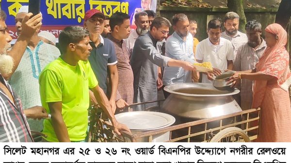 সিলেট মহানগর এর ২৫ ও ২৬ নং ওয়ার্ড বিএনপির উদ্দ্যোগে শনিবার (২২ জুন) নগরীর রেলওয়ে আশ্রয় কেন্দ্রে বন্যাদুর্গত মানুষের মাঝে রান্না করা খাবার বিতরণ করা হয়।