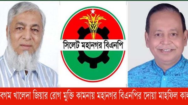বিএনপির চেয়ারপার্সন সাবেক তিন বারের সফল প্রধানমন্ত্রী দেশমাতা বেগম খালেদা জিয়ার আশু রোগ মুক্তি কামনায় মহানগর বিএনপির উদ্দোগে আগামীকাল রবিবার (২৩ জুন) বাদ আছর হজরত শাহজালাল (রহ.) দরগাহ মসজিদে দোয়া মাহফিল অনুষ্ঠিত হবে।