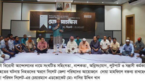 কোটা বিরোধী আন্দোলনের নামে সংঘটিত সহিংসতা, নাশকতা, অগ্নিসংযোগ, লুটপাট ও সন্ত্রাসী কর্মকান্ডে হতাহতের ঘটনায় নিহতদের স্মরণে মঙ্গলবার ৩০ জুলাই সিলেট জেলা পরিষদের আয়োজনে শোক পালন করা এবং নিহতদের আত্মার মাগফিরাত কামনা করে বিশেষ দোয়া আয়োজনের জন্য মন্ত্রীসভা বৈঠকের গৃহীত সিদ্ধান্তের অংশ হিসেবে জেলা পরিষদের আয়োজনে ৩০ জুলাই বাদ জোহর এক বিশেষ দোয়া মাহফিলের আয়োজন করা হয়।