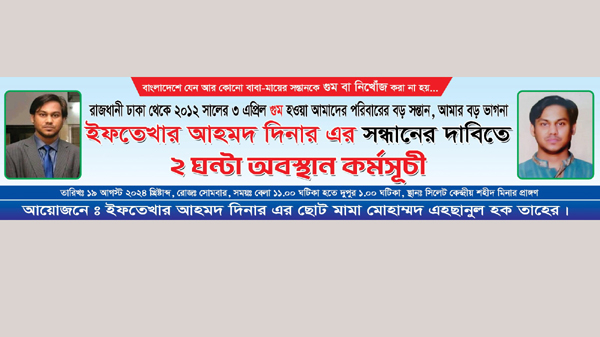 ইফতেখার আহমদ দিনারের সন্ধানের দাবীতে ২ ঘন্টার অবস্থান কর্মসূচীতে দিনারের আত্মীয়স্বজন, সাংগঠনিক সহযোদ্ধা সহ সর্বস্তরের নাগরিকদের উপস্থিত থাকার আহবান আহবান জানিয়েছেন সমাজকর্মী মোহাম্মদ এহছানুল হক তাহের।