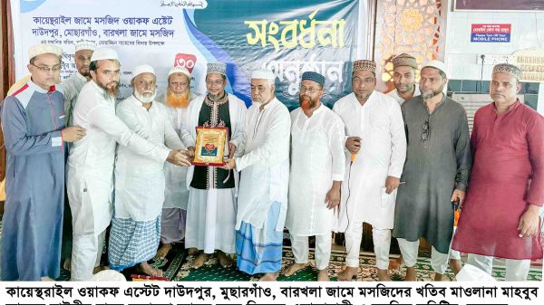 কায়েস্থরাইল ওয়াকফ এস্টেট দাউদপুর, মুছারগাঁও, বারখলা জামে মসজিদের খতিব মাওলানা মাহবুব আহমদ নাঈমী, ছানী ইমাম হাফিজ শাহীন আহমদ ও মোয়াজ্জিন হাফিজ ছাইফুল ইসলামের বিদায় সংবর্ধনা শুক্রবার (৩০ আগস্ট) বাদ জুম্মা মসজিদে অনুষ্ঠিত হয়।