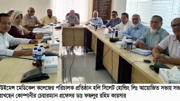 শনিবার (৩১ আগষ্ট) দুপুরে সিলেট উইমেন্স মেডিকেল কলেজ হলরুমে অনুষ্ঠিত সভায় এক সভায় এসব সিদ্ধান্ত নেয়া হয়। মেডিকেলের পরিচালক প্রতিষ্ঠান হলি সিলেট হোল্ডিং লিঃ এর চেয়ারম্যান ডা. ফজলুর রহিম কায়সারের সভাপতিত্বে অনুষ্ঠিত সভায় বক্তব্য রাখেন ও উপস্থিত ছিলেন, হলি সিলেট হোল্ডিং লিঃ এর ভাইস চেয়ারম্যান ডা. এম এ মতিন ও মুহাম্মদ ফখরুল ইসলাম, সিলেট উইমেন্স মেডিকেল কলেজের অধ্যক্ষ ডা. শাহানা ফেরদৌস চৌধুরী, হলি সিলেট হোল্ডিং লিঃ এর ব্যবস্থাপনা পরিচালক ডা. অয়েস আহমদ চৌধুরী, পরিচালক এমদাদ হোসেন চৌধুরী, মোস্তাক আহমদ, নুরুল ইসলাম খান, ডা. জিয়াউর রহমান, বশির আহমদ, ডা. শফিক আহমদ, ডা. এম এ সালাম প্রমূখ।