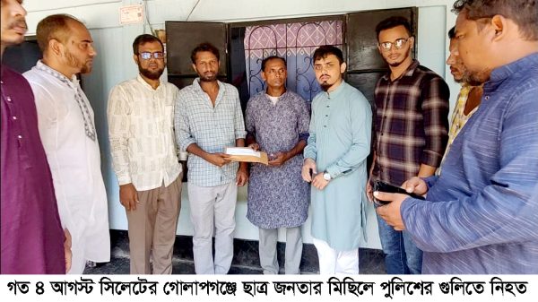 গত ৪ আগস্ট সিলেটের গোলাপগঞ্জে ছাত্র জনতার মিছিলে পুলিশের গুলিতে নিহত শহীদদের পরিবারের পাশে দাড়িয়েছে সানাবিল ফাউন্ডেশন।