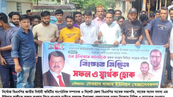 নিখোঁজ বিএনপির জাতীয় নির্বাহী কমিটির সাংগঠনিক সম্পাদক ও সিলেট জেলা বিএনপির সাবেক সভাপতি, সাবেক সংসদ সদস্য এম ইলিয়াস আলীকে অক্ষত অবস্থায় ফিরে পাওয়ার দাবীতে বালাগঞ্জ উপজেলা স্বেচ্ছাসেবক দলের উদ্যোগে বিক্ষোভ মিছিল ও সমাবেশে দেওয়ান বাজার ইউনিয়ন স্বেচ্ছাসেবক দল মিছিল সহকারে যোগদান করেছেন।