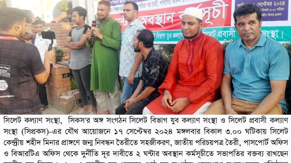 বৃহত্তর সিলেটের অরাজনৈতিক কল্যাণমূলক স্বেচ্ছাসেবী সামাজিক সংগঠন সিলেট কল্যাণ সংস্থা (সিকস), সিলেট বিভাগের যুব সংগঠন, আত্মকর্মী ও বাংলাদেশ প্রেমী সৃষ্টিশীল যুবদের সমন্বয়ে এ প্রজন্মের মুক্তিযোদ্ধাদের নিয়ে গঠিত অরাজনৈতিক স্বেচ্ছাসেবী সামাজিক যুব সংগঠন সিকস’র অঙ্গ সংগঠন সিলেট বিভাগ যুব কল্যাণ সংস্থা (সিবিযুকস) এবং বাংলাদেশী প্রবাসীদের সবধরনের দাবী উপস্থাপনের বলিষ্ঠ অরাজনৈতিক সংগঠন সিলেট প্রবাসী কল্যাণ সংস্থা (সিপ্রকস)-এর যৌথ আয়োজনে মঙ্গলবার (১৭ সেপ্টেম্বর ২০২৪) বিকাল ৩টায় সিলেট কেন্দ্রীয় শহীদ মিনার প্রাঙ্গণে জন্ম নিবন্ধন তৈরীতে সহজীকরণ, জাতীয় পরিচয়পত্র তৈরী, পাসপোর্ট অফিস ও বিআরটিএ অফিস থেকে দুর্নীতি দূর দাবীতে ২ ঘন্টার অবস্থান কর্মসূচী অনুষ্ঠিত হয়। ২ ঘন্টার অবস্থান কর্মসূচী থেকে আগামী ৩০ সেপ্টেম্বর সোমবার বেলা ১১টায় পাসপোর্ট অফিসের দুর্নীতিবাজ কর্মকর্তা-কর্মচারীদের অপসারণের দাবীতে সিলেট কেন্দ্রীয় শহীদ মিনার প্রাঙ্গণ হতে বিভাগীয় পাসপোর্ট ও ভিসা অফিস, সিলেট অভিমুখে পদযাত্রা ঘোষনা করা হয়।