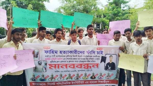 সিলেট পলিটেকনিক ইনস্টিটিউট’র সাবেক শিক্ষার্থী ফাহিম চৌধুরী আকাশ (২৪) হত্যাকারীদের ফাঁসির দাবিতে মানববন্ধন করেছেন সাধারণ শিক্ষার্থীরা।
