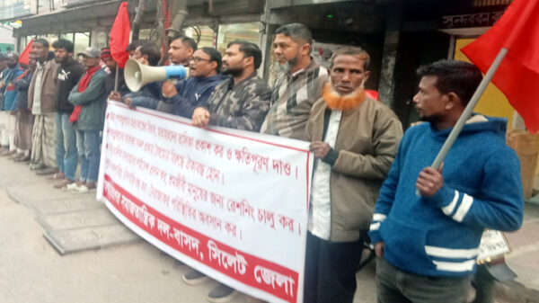 শতাধিক পণ্যে শুল্ক-করারোপ, টিসিবির ট্রাক সেল বন্ধ ও ৪৩ লাখ পরিবারের ফ্যামিলি কার্ড বাতিলের সিদ্ধান্ত প্রত্যাহার, প্রয়োজনীয় সংস্কার করে দ্রুত নির্বাচনী রোডম্যাপ ঘোষণা করার দাবিতে বাংলাদেশের সমাজতান্ত্রিক দল-বাসদ সিলেট জেলা শাখার উদ্যোগে মানববন্ধন ও বিক্ষোভ সমাবেশ অনুষ্ঠিত হয়।